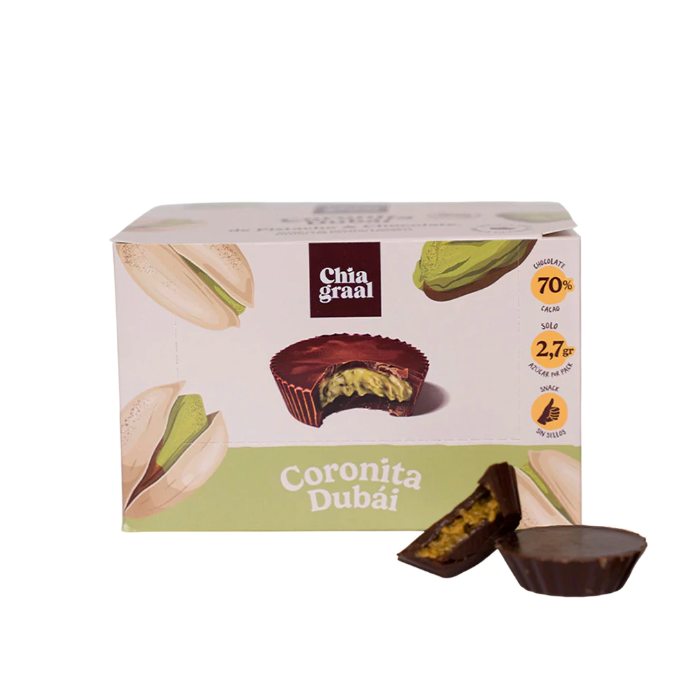 Seleccionamos y tostamos los mejores pistachos, los procesamos hasta obtener una pasta deliciosa y la mezclamos con un toque crocante que hace que el sabor Dubai cobre vida. Luego, formamos las coronitas y las bañamos con chocolate amargo de la mejor calidad, con un 70% de cacao, sin aceites añadidos ni excesos de azúcares.